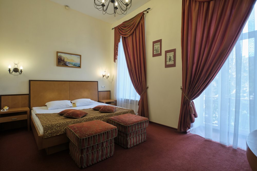 Категория "Сюит" представлена элегантными номерами с балконами. Интерьер номеров выполнен в венецианском стиле. Теплые бордовые тона, комфортная широкая кровать и мягкие подушки – все создано для того, чтобы вы могли полностью насладиться отдыхом после работы или прогулок по Петербургу. С балкона номера открывает чудесный вид на тихую зеленую линию.
